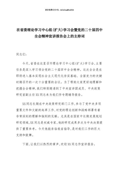 【七哥公文】2025年:在省委理论学习中心组(扩大)学习会暨党的二十届四中全会精神宣讲报告会上的主持词+更多免费公文+VX:QiGeGongWen2024