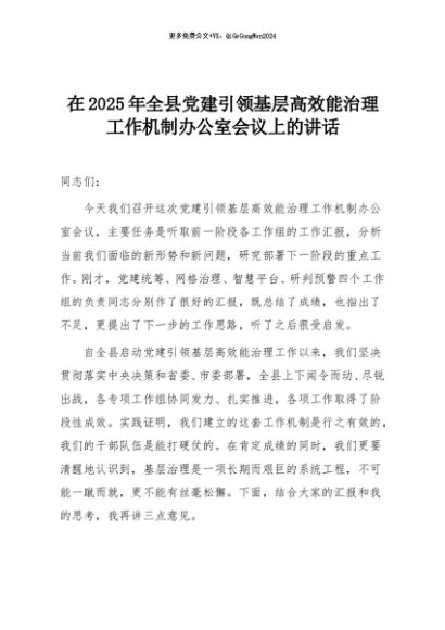 【七哥公文】2025年:在2025年全县党建引领基层高效能治理工作机制办公室会议上的讲话+更多免费公文+VX:QiGeGongWen2024