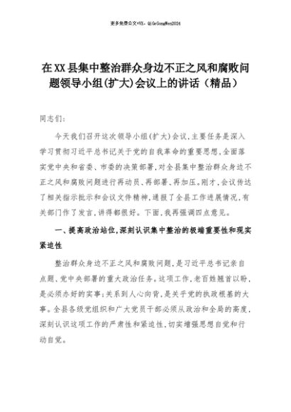 【七哥公文】2025年:在XX县集中整治群众身边不正之风和腐败问题领导小组(扩大)会议上的讲话(精品)+更多免费公文+VX:QiGeGongWen2024