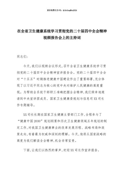 【七哥公文】2025年:在全省卫生健康系统学习贯彻党的二十届四中全会精神视频报告会上的主持词+更多免费公文+VX:QiGeGongWen2024