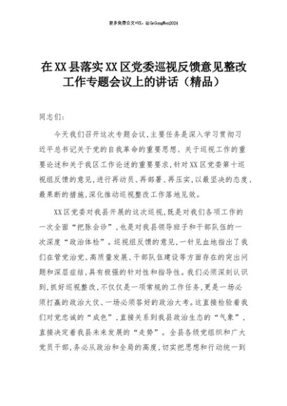 【七哥公文】2025年:在XX县落实XX区党委巡视反馈意见整改工作专题会议上的讲话(精品)+更多免费公文+VX:QiGeGongWen2024