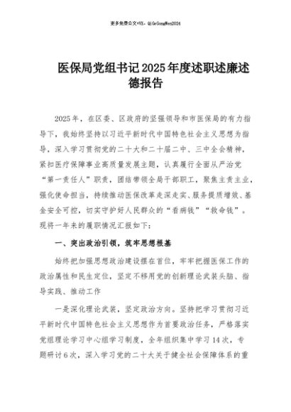 / 【七哥公文】2025年:医保局党组书记2025年度述职述廉述德报告+更多免费公文+VX:QiGeGongWen2024