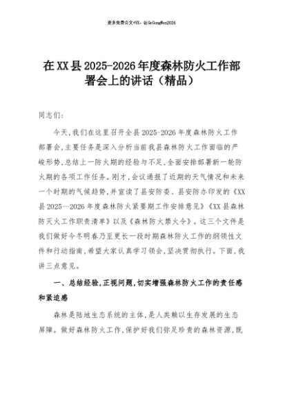 【七哥公文】2025年:在XX县2025-2026年度森林防火工作部署会上的讲话(精品)+更多免费公文+VX:QiGeGongWen2024