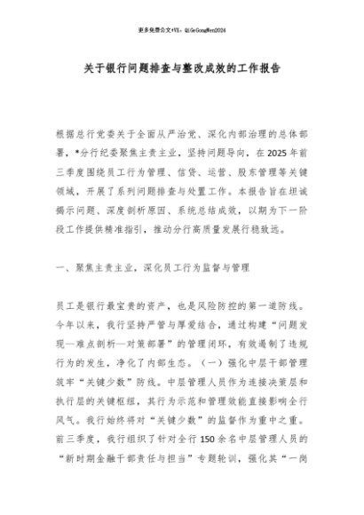 / 【七哥公文】2025年:关于银行问题排查与整改成效的工作报告_副本+更多免费公文+VX:QiGeGongWen2024