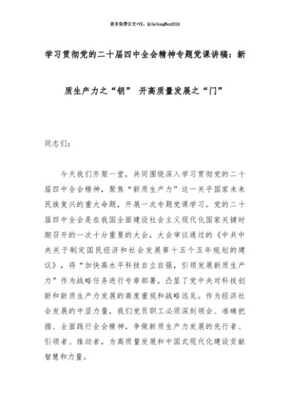 【七哥公文】2025年:学习贯彻党的二十届四中全会精神专题党课讲稿:新质生产力之“钥” 开高质量发展之“门”_副本+更多免费公文+VX:QiGeGongWen2024