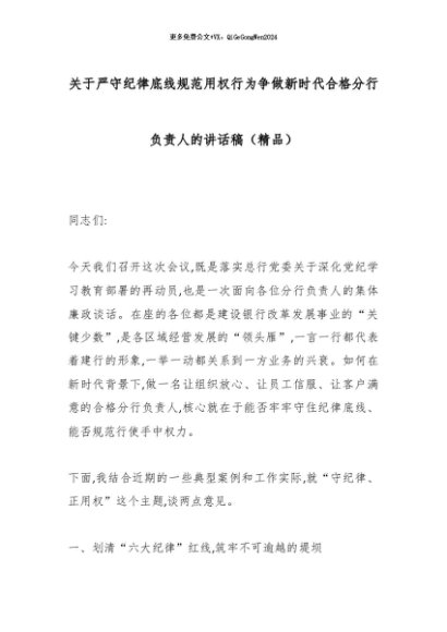 【七哥公文】2025年:关于严守纪律底线规范用权行为争做新时代合格分行负责人的讲话稿(精品)_副本+更多免费公文+VX:QiGeGongWen2024