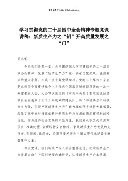 【七哥公文】2025年:学习贯彻党的二十届四中全会精神专题党课讲稿:新质生产力之“钥”开高质量发展之“门”+更多免费公文+VX:QiGeGongWen2024