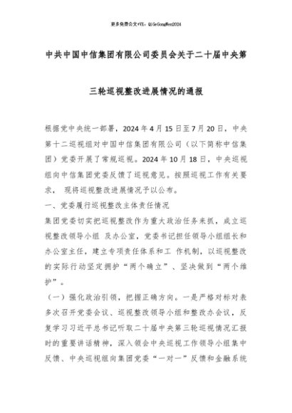 【七哥公文】2025年:中共中国中信集团有限公司委员会关于二十届中央第三轮巡视整改进展情况的通报_副本+更多免费公文+VX:QiGeGongWen2024