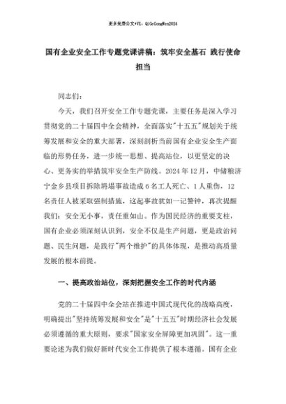 【七哥公文】2025年:国有企业安全工作专题党课讲稿:筑牢安全基石 践行使命担当+更多免费公文+VX:QiGeGongWen2024