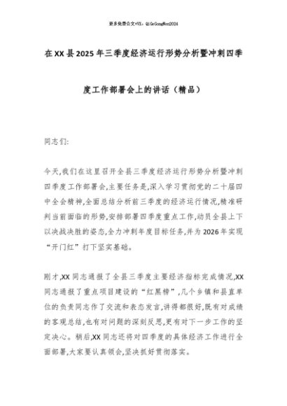 【七哥公文】2025年:在XX县2025年三季度经济运行形势分析暨冲刺四季度工作部署会上的讲话(精品)_副本+更多免费公文+VX:QiGeGongWen2024