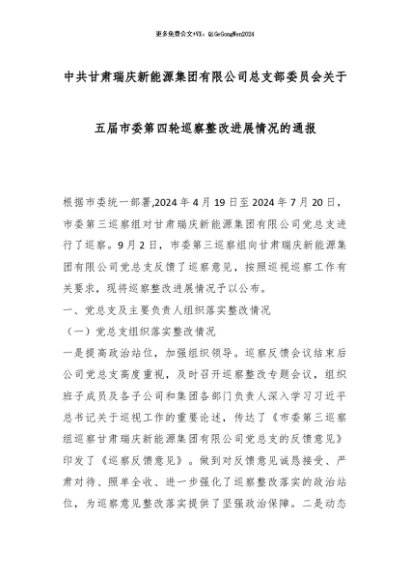 【七哥公文】2025年:中共甘肃瑞庆新能源集团有限公司总支部委员会关于五届市委第四轮巡察整改进展情况的通报_副本+更多免费公文+VX:QiGeGongWen2024