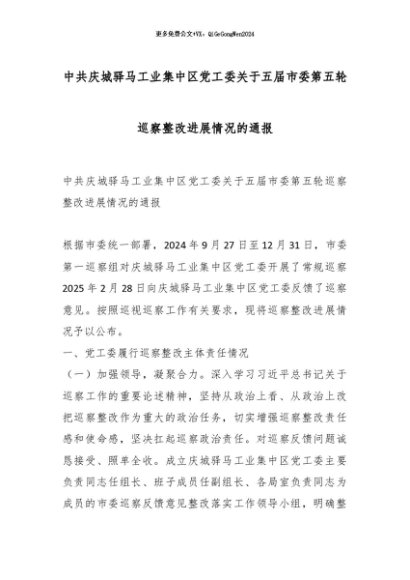 【七哥公文】2025年:中共庆城驿马工业集中区党工委关于五届市委第五轮巡察整改进展情况的通报_副本+更多免费公文+VX:QiGeGongWen2024