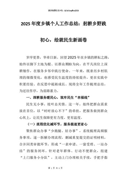 【七哥公文】2025年:2025年度乡镇个人工作总结:躬耕乡野践初心,绘就民生新画卷(1)+更多免费公文+VX:QiGeGongWen2024