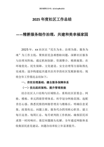 【七哥公文】2025年:2025年度社区工作总结:精耕服务细作治理,共建和美幸福家园+更多免费公文+VX:QiGeGongWen2024
