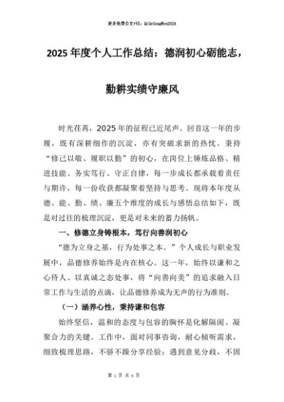【七哥公文】2025年:2025年度个人工作总结:德润初心砺能志,勤耕实绩守廉风(1)+更多免费公文+VX:QiGeGongWen2024