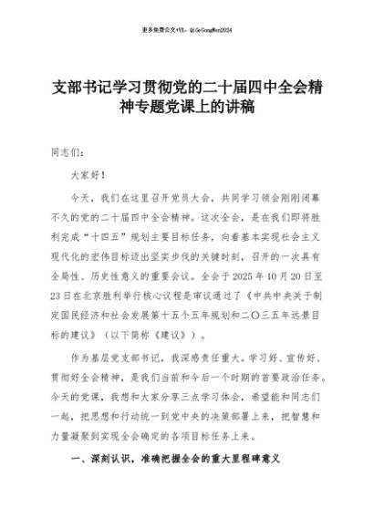 【七哥公文】2025年:支部书记学习贯彻党的二十届四中全会精神专题党课上的讲稿+更多免费公文+VX:QiGeGongWen2024