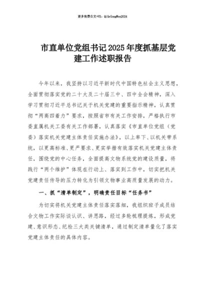 【七哥公文】2025年:市直单位党组书记2025年度抓基层党建工作述职报告+更多免费公文+VX:QiGeGongWen2024