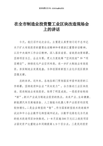 / 【七哥公文】2025年:在全市制造业投资暨工业区块改造现场会上的讲话+更多免费公文+VX:QiGeGongWen2024