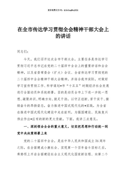 / 【七哥公文】2025年:在全市传达学习贯彻全会精神干部大会上的讲话+更多免费公文+VX:QiGeGongWen2024