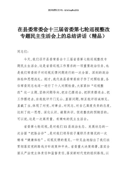 【七哥公文】2025年:在县委常委会十三届省委第七轮巡视整改专题民主生活会上的总结讲话(精品)+更多免费公文+VX:QiGeGongWen2024