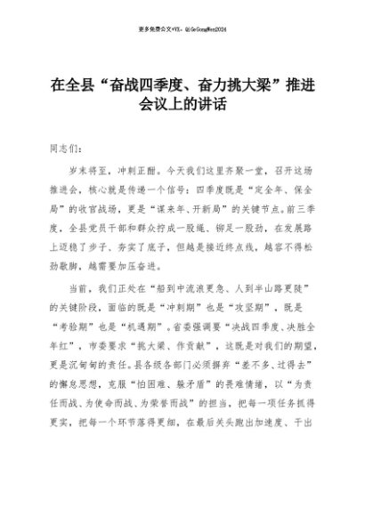 / 【七哥公文】2025年:在全县“奋战四季度、奋力挑大梁”推进会议上的讲话+更多免费公文+VX:QiGeGongWen2024
