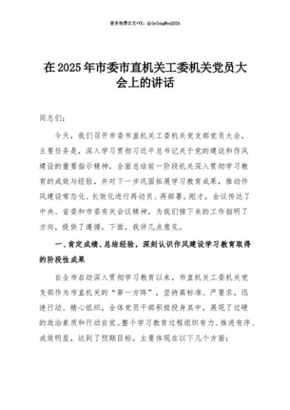 / 【七哥公文】2025年:在2025年市委市直机关工委机关党员大会上的讲话+更多免费公文+VX:QiGeGongWen2024