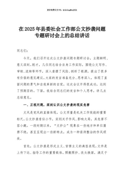 【七哥公文】2025年:在2025年县委社会工作部公文抄袭问题专题研讨会上的总结讲话+更多免费公文+VX:QiGeGongWen2024