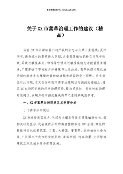 / 【七哥公文】2025年:关于XX市蒿草治理工作的建议(精品)+更多免费公文+VX:QiGeGongWen2024