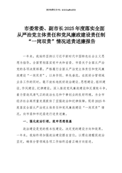 【七哥公文】2025年:市委常委、副市长2025年度落实全面从严治党主体责任和党风廉政建设责任制“一岗双责”情况述责述廉报告+更多免费公文+VX:QiGeGongWen2024