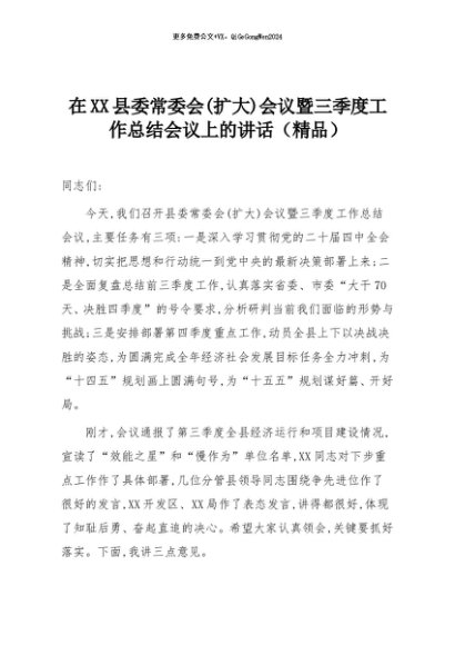 【七哥公文】2025年:在XX县委常委会(扩大)会议暨三季度工作总结会议上的讲话(精品)+更多免费公文+VX:QiGeGongWen2024