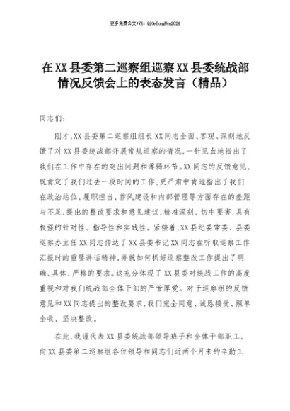 【七哥公文】2025年:在XX县委第二巡察组巡察XX县委统战部情况反馈会上的表态发言(精品)+更多免费公文+VX:QiGeGongWen2024