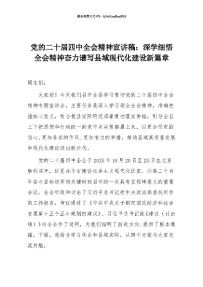 【七哥公文】2025年:党的二十届四中全会精神宣讲稿:深学细悟全会精神奋力谱写县域现代化建设新篇章+更多免费公文+VX:QiGeGongWen2024