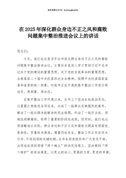 【七哥公文】2025年:在2025年深化群众身边不正之风和腐败问题集中整治推进会议上的讲话+更多免费公文+VX:QiGeGongWen2024