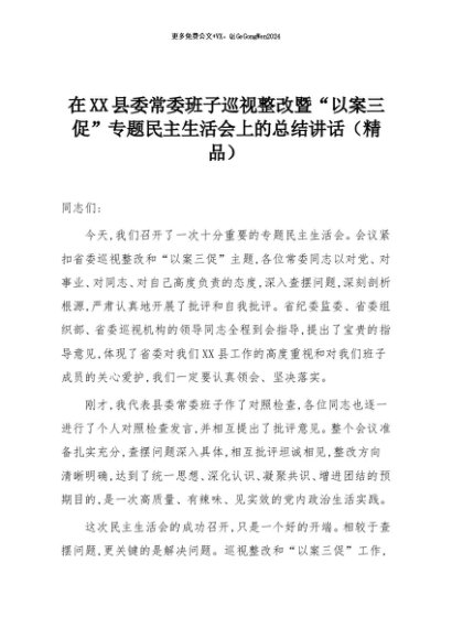 【七哥公文】2025年:在XX县委常委班子巡视整改暨“以案三促”专题民主生活会上的总结讲话(精品)+更多免费公文+VX:QiGeGongWen2024