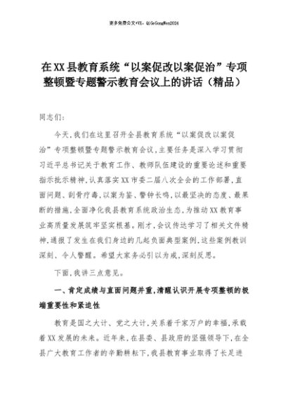 【七哥公文】2025年:在XX县教育系统“以案促改以案促治”专项整顿暨专题警示教育会议上的讲话(精品)+更多免费公文+VX:QiGeGongWen2024