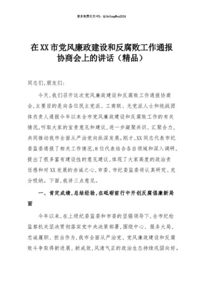 【七哥公文】2025年:在XX市党风廉政建设和反腐败工作通报协商会上的讲话(精品)+更多免费公文+VX:QiGeGongWen2024