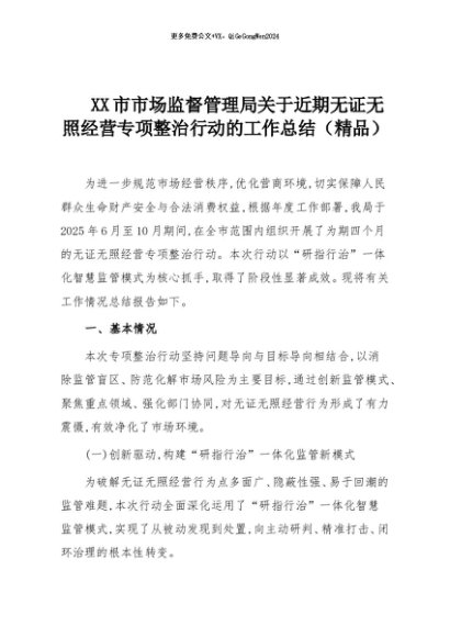 【七哥公文】2025年:XX市市场监督管理局关于近期无证无照经营专项整治行动的工作总结(精品)+更多免费公文+VX:QiGeGongWen2024
