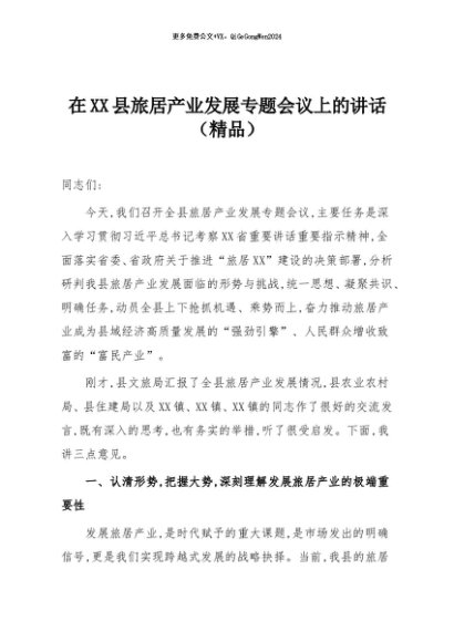 【七哥公文】2025年:在XX县旅居产业发展专题会议上的讲话(精品)+更多免费公文+VX:QiGeGongWen2024
