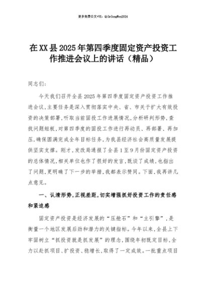 【七哥公文】2025年:在XX县2025年第四季度固定资产投资工作推进会议上的讲话(精品)+更多免费公文+VX:QiGeGongWen2024
