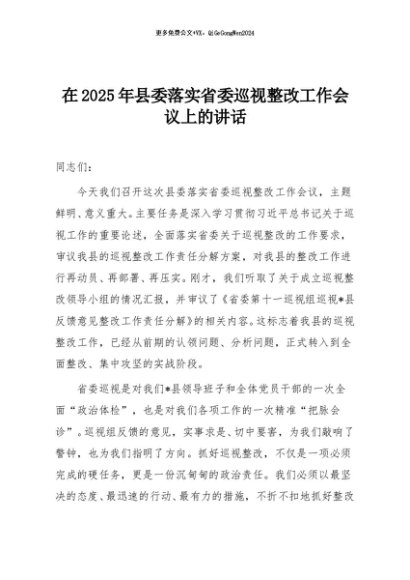 / 【七哥公文】2025年:在2025年县委落实省委巡视整改工作会议上的讲话+更多免费公文+VX:QiGeGongWen2024