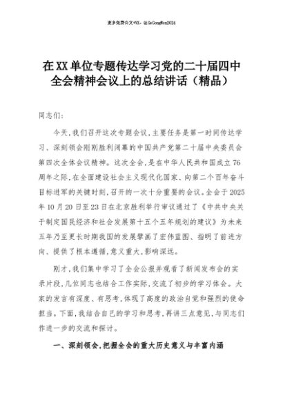 【七哥公文】2025年:在XX单位专题传达学习党的二十届四中全会精神会议上的总结讲话(精品)+更多免费公文+VX:QiGeGongWen2024
