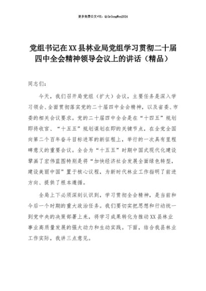 【七哥公文】2025年:党组书记在XX县林业局党组学习贯彻二十届四中全会精神领导会议上的讲话(精品)+更多免费公文+VX:QiGeGongWen2024