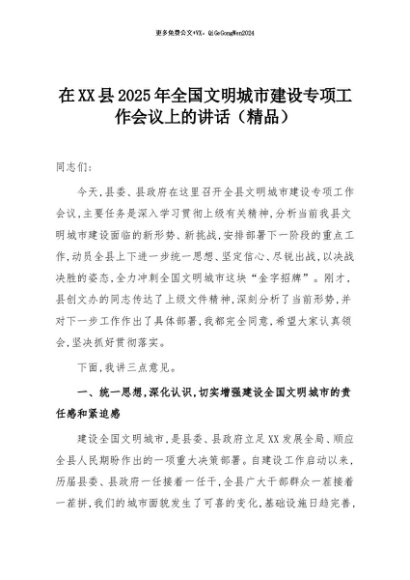 【七哥公文】2025年:在XX县2025年全国文明城市建设专项工作会议上的讲话(精品)+更多免费公文+VX:QiGeGongWen2024