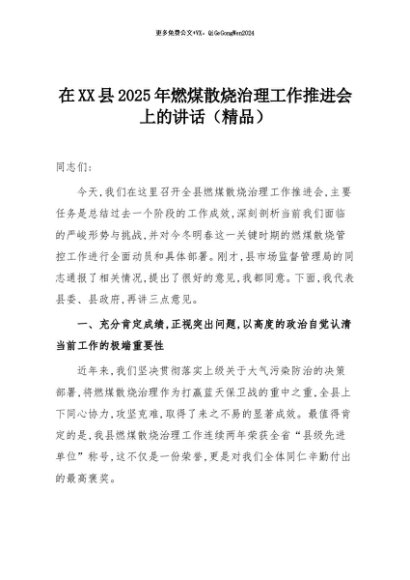 【七哥公文】2025年:在XX县2025年燃煤散烧治理工作推进会上的讲话(精品)+更多免费公文+VX:QiGeGongWen2024