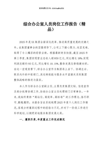 【七哥公文】2025年:综合办公室人员岗位工作报告(精品)+更多免费公文+VX:QiGeGongWen2024