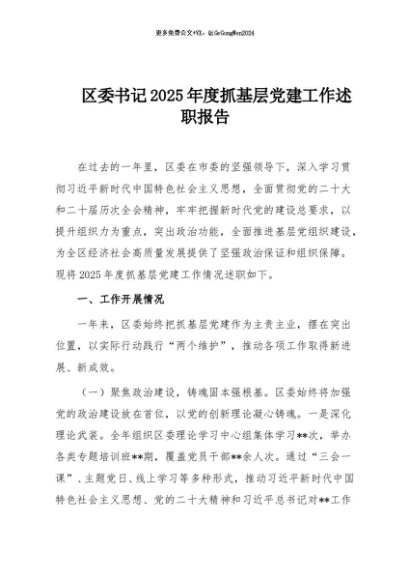 / 【七哥公文】2025年:区委书记2025年度抓基层党建工作述职报告+更多免费公文+VX:QiGeGongWen2024