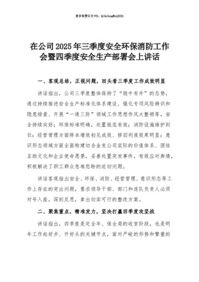 【七哥公文】2025年:在公司2025年三季度安全环保消防工作会暨四季度安全生产部署会上讲话+更多免费公文+VX:QiGeGongWen2024