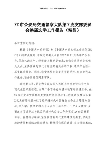 【七哥公文】2025年:XX市公安局交通警察大队第X党支部委员会换届选举工作报告(精品)+更多免费公文+VX:QiGeGongWen2024