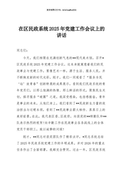 / 【七哥公文】2025年:在区民政系统2025年党建工作会议上的讲话+更多免费公文+VX:QiGeGongWen2024