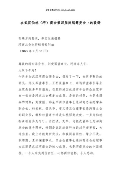 【七哥公文】2025年:在武汉仙桃(沔)商会第四届换届筹委会上的致辞_副本+更多免费公文+VX:QiGeGongWen2024